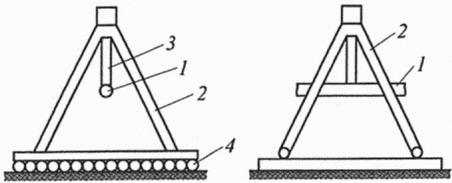 VII Надземный способ с качающимися опорами 1 - трубопровод; 2 - опора; 3 - подвеска; 4 - подкладки из бревен | Преимущества: те же, что и для способа VI; максимально приспособлена к компенсации температурных деформаций труб. Недостатки: те же, что и для способа V | Для трубопроводов диаметром меньше 400 мм, расположенных в сейсмических районах |