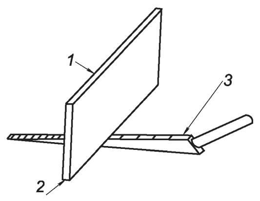 При выявлении свободного пространства между линейкой и исследуемой поверхностью измеряют зазор с помощью измерительного клина (вставляя клин измерительный в пространство между линейкой и исследуемой поверхностью), как показано на