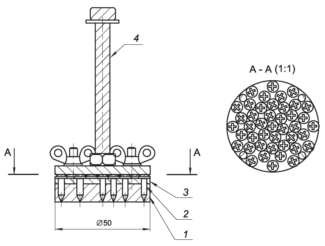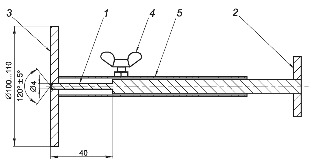 Для проведения испытаний на смонтированном резиновом покрытии применяют устройство для измерения толщины, состоящее из стального зонда круглого сечения диаметром 4 мм, угол острия 120° +/- 5°, как показано на