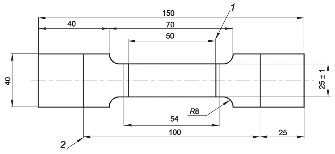 1 - длина (300 +/- 1) мм; 2 - ширина (25 +/- 1) мм