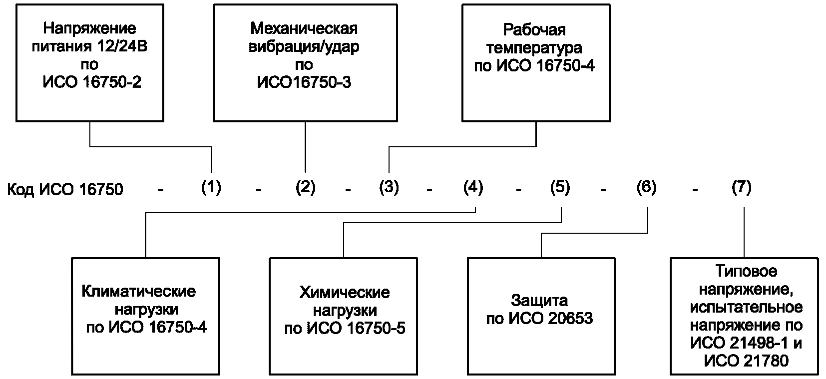 Целью стандартов серии ИСО 16750 является определение классов требований для отдельных типов нагрузок. В них различают электрические, механические, термические, климатические нагрузки и химические воздействия. Для каждого типа нагрузки определено несколько классов требований. Каждый класс требований обозначается определенной буквой кода. Полный набор требований создается путем определения кодовой комбинации букв. Кодовые буквы определены в соответствующих разделах настоящего стандарта. Кроме того, в таблицах, приведенных в приложениях к каждой части, указаны обычные места установки и приведены примеры соответствующих кодовых обозначений. Для обычных применений используются эти кодовые обозначения. Если применение компонента является специфичным и данные комбинации кодовых букв использованы быть не могут, можно создать новые комбинации кодовых букв. Если ни один из приведенных буквенных кодов не подходит, можно создать новые уровни требований, используя кодовую букву Z. В этом случае конкретные требования определяются отдельно, при этом желательно не менять методы испытаний.