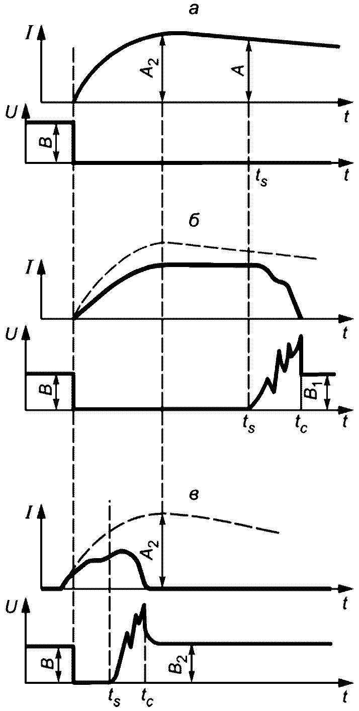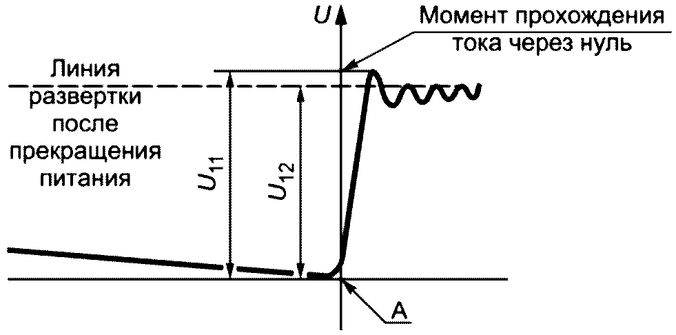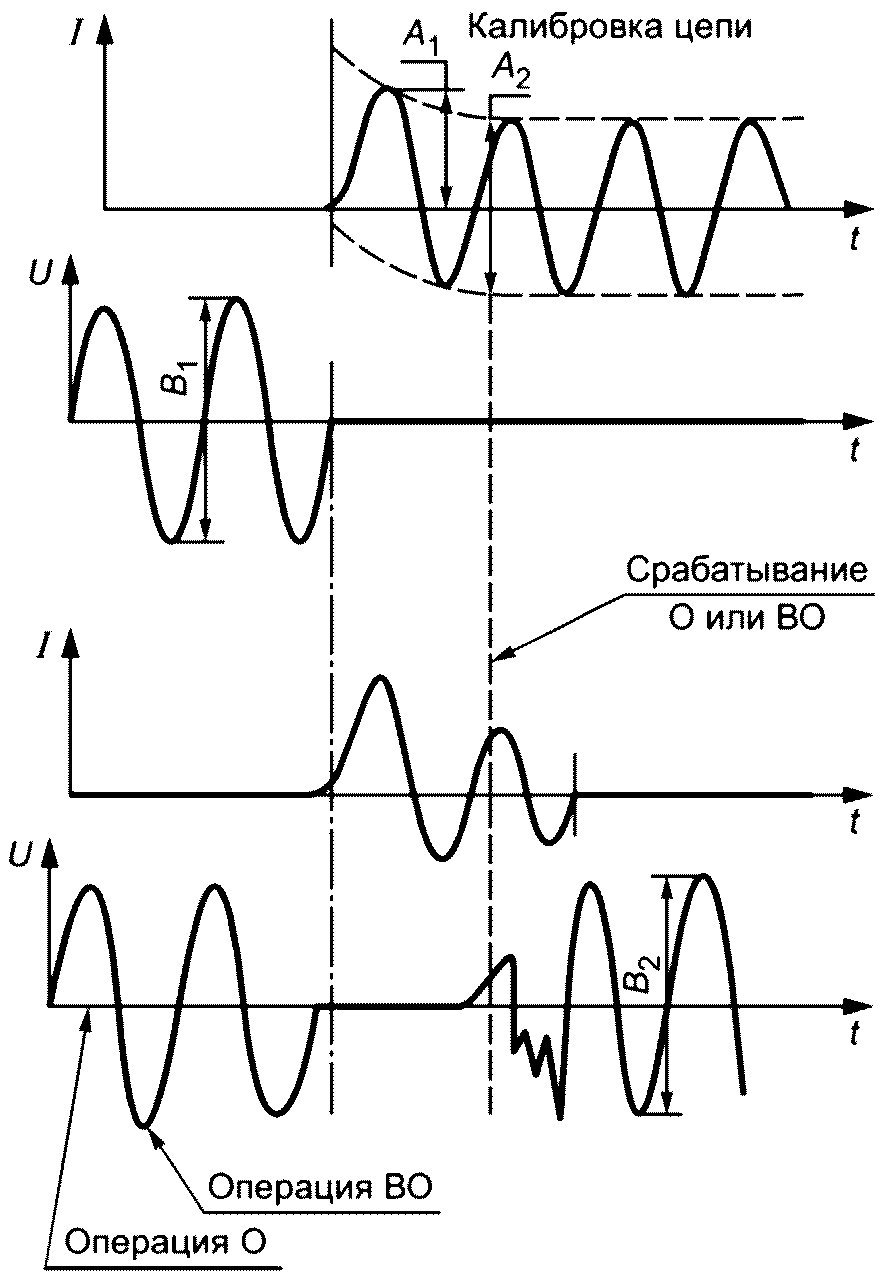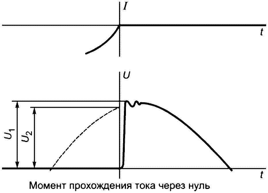 в основном определяются собственной частотой и затуханием цепи нагрузки. Поскольку эти параметры не зависят от напряжения перед включением и его частоты, в процессе регулирования возможно питание цепи нагрузки из источника переменного тока, напряжение и частота которого могут отличаться от свойственных источнику питания, использованному при испытаниях оборудования. Цепь размыкается диодом при прохождении тока через нуль, и колебания восстанавливающегося и возвращающегося напряжения наблюдаются на экране электронного осциллографа, в котором развертка синхронизируется с частотой источника питания (см.