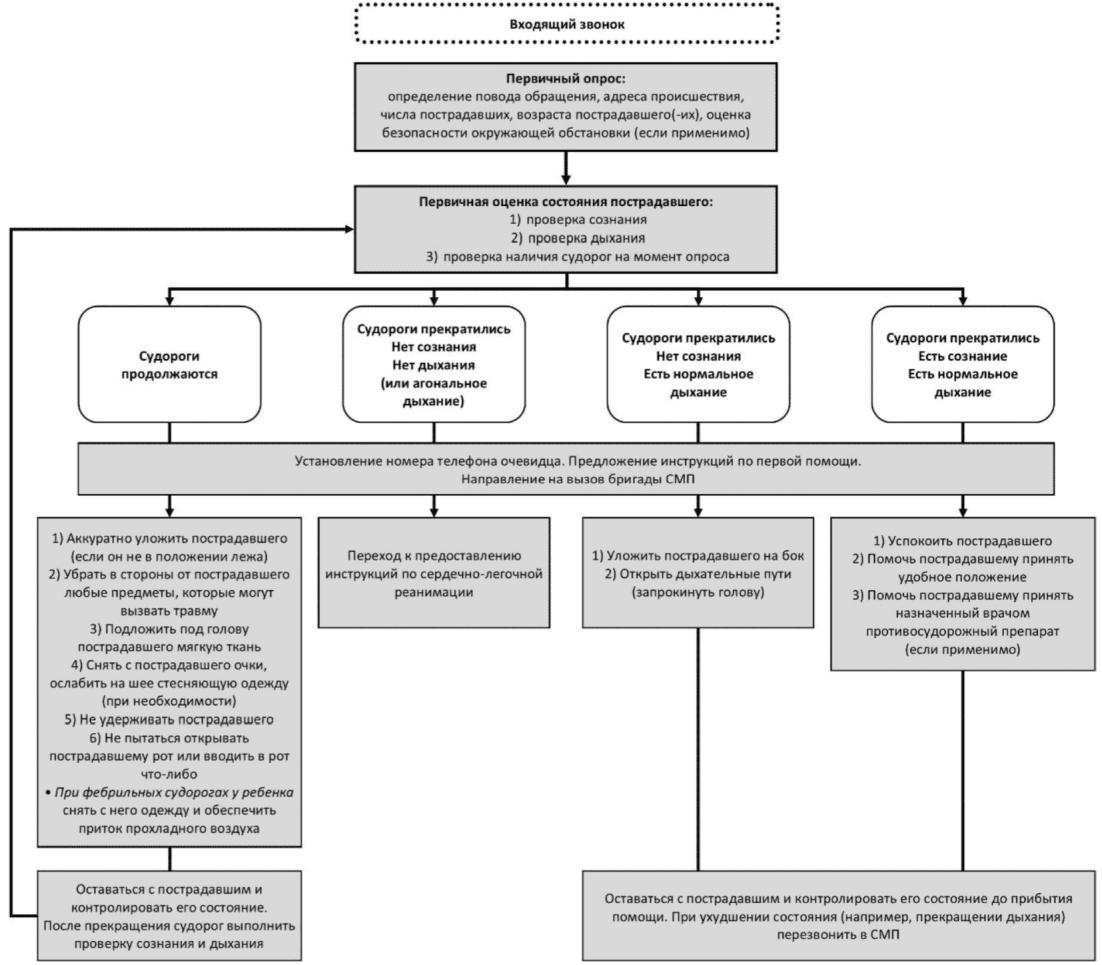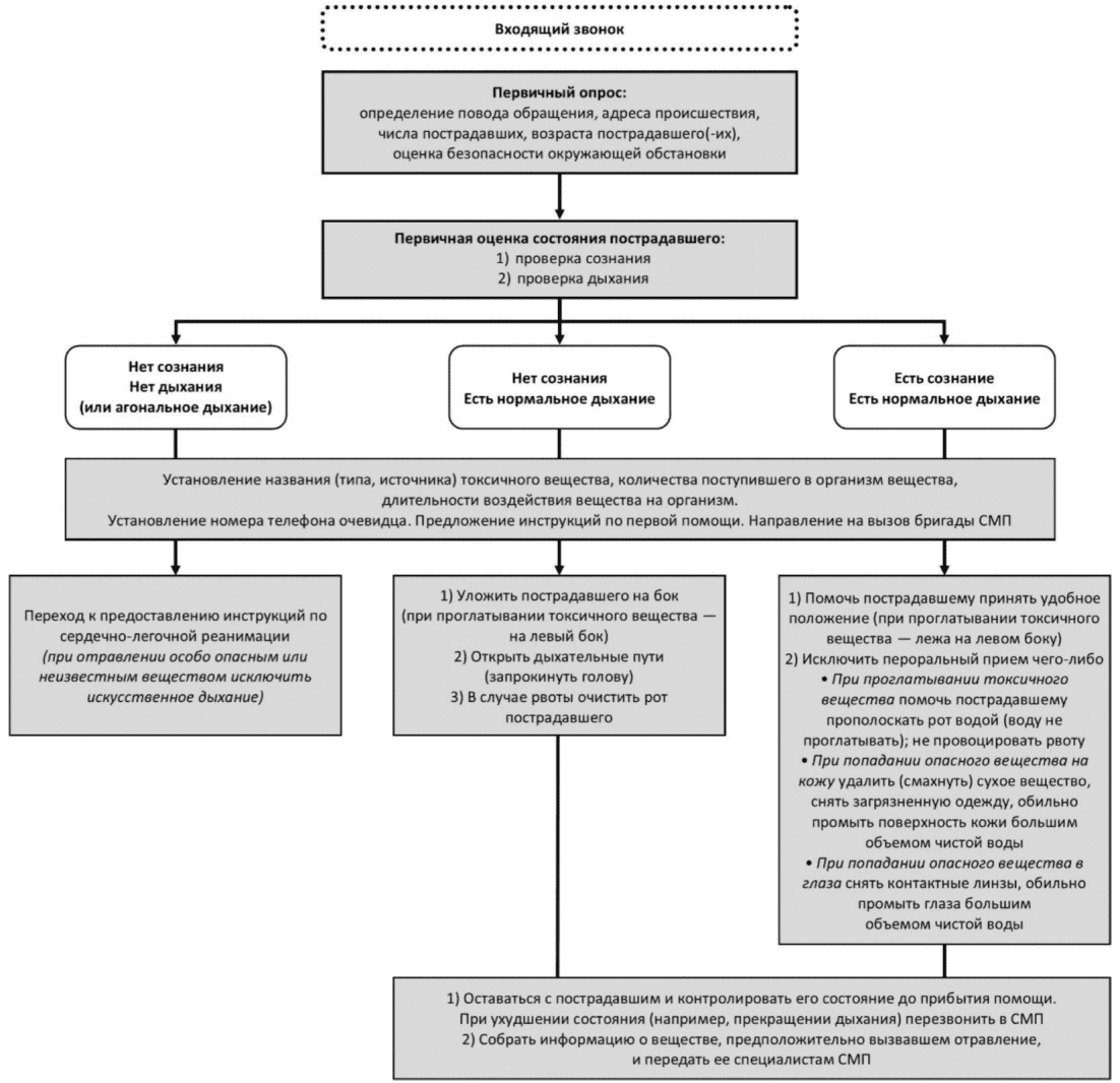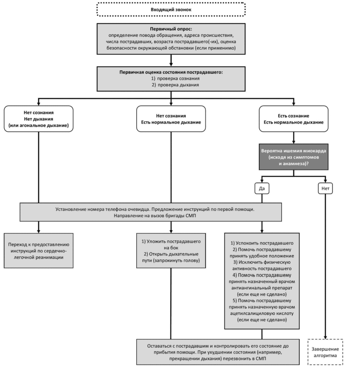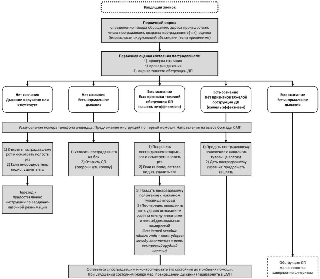Исполнение алгоритма предполагает последовательный опрос диспетчером очевидца и предоставление ему кратких инструкций по первой помощи, объем и содержание которых могут зависеть от тяжести состояния пострадавшего, возраста пострадавшего и обстоятельств происшествия. Отдельные элементы опроса в соответствии с алгоритмом могут быть пропущены диспетчером с целью скорейшего перехода к предоставлению инструкций по первой помощи, но только в тех случаях, когда соответствующая информация уже была самостоятельно предоставлена очевидцем при первичном описании обстоятельств происшествия. Например, если до начала опроса по алгоритму очевидец сообщил, что ребенок подавился, потерял сознание и не дышит, целесообразен быстрый переход к предоставлению соответствующих инструкций по первой помощи без дополнительного опроса.