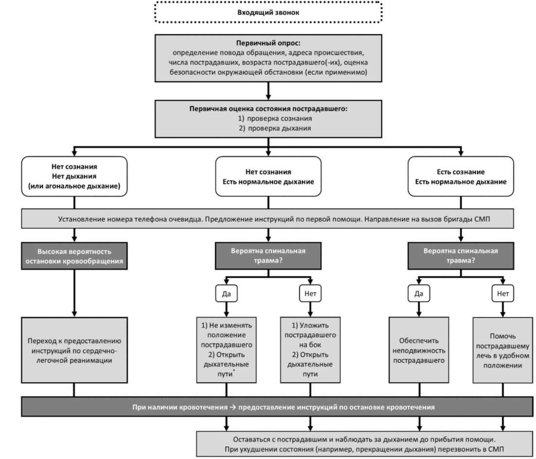 (приложение I-А) после первичного опроса (включая определение повода обращения в СМП, адреса происшествия, числа пострадавших, возраста пострадавшего(-их) и оценку безопасности окружающей обстановки, когда это применимо) диспетчер должен оперативно проверить сознание и дыхание пострадавшего.