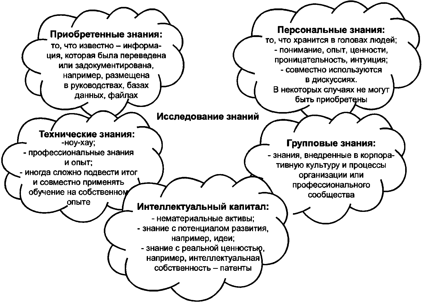 Знание представляет собой набор данных и информации (с точки зрения некоторой определенной информационной технологии). Знание также включает различные комбинации новой технологии, производственного опыта, эмоций, верований, значений величин, идей, интуиции, любопытства, мотивации, стилей обучения, отношения, способности доверять, способности решать сложные проблемы, открытости, умения работать в компьютерной сети, коммуникабельности, отношения к риску и наличия духа предпринимательства. Использование знаний приводит к накоплению ценных активов, улучшает способность действовать и принимать эффективные решения. Знание может быть формализованным и неформализованным, персональным и коллективным.