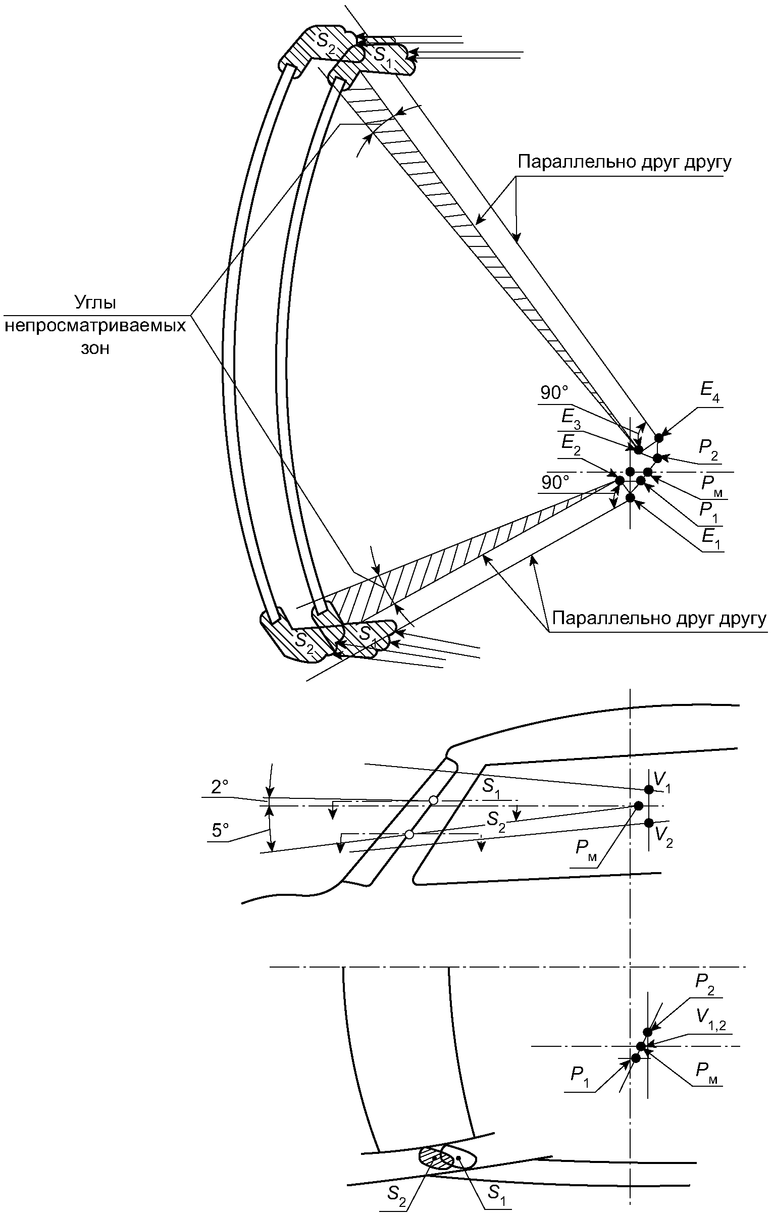 Примечание - Характеризуется расположением исходных точек переднего окна Pri, P'ri, степенью очистки зон А и Б переднего окна, полем обзора П, непросматриваемыми зонами в поле обзора П, а также непросматриваемыми зонами, создаваемыми стойками переднего окна.