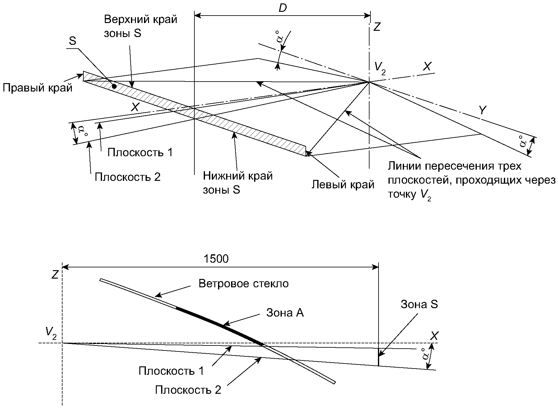2.6 зона S: Условная зона в поле обзора П, представляющая собой вертикальный прямоугольник, отстоящий на расстоянии 1500 мм от точки V2 в направлении вперед.