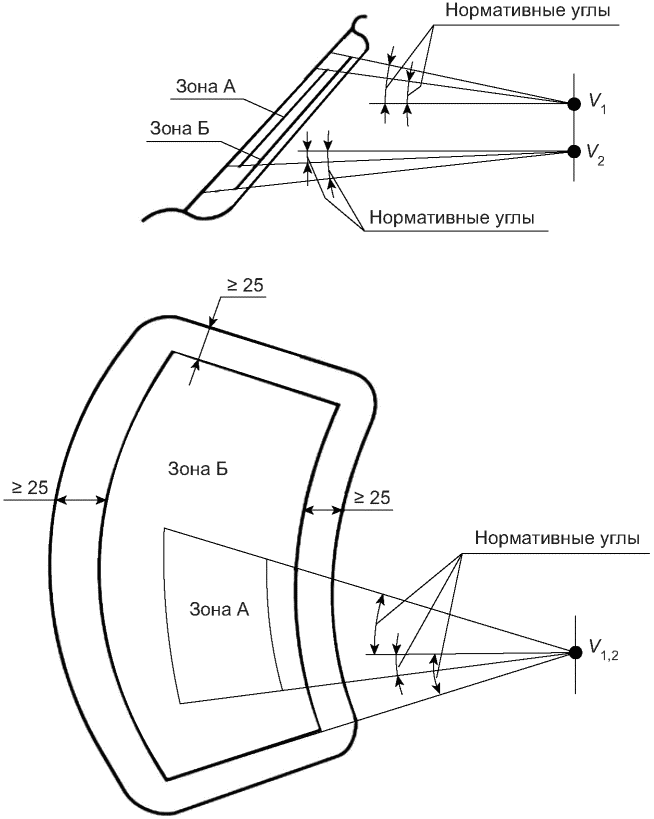 2.5 зоны I, А и Б переднего окна: Условные зоны на наружной поверхности прозрачной части ветрового стекла ТС.