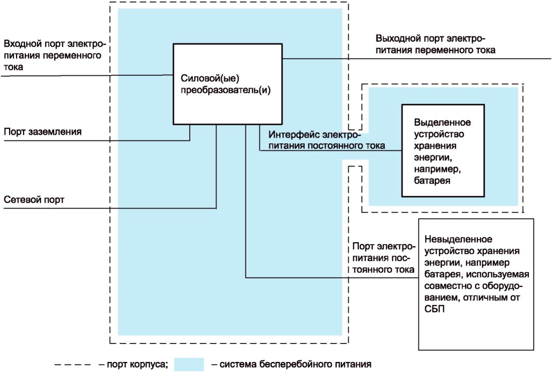 Примечание 3 - Принимают во внимание, что различные условия испытаний необходимы для охвата диапазона физических размеров и номинальной мощности всего СБП. Полная СБП может состоять из одного или нескольких соединенных между собой блоков. Подробную информацию о конфигурации СБП см. в IEC 62040-3:2011, приложение A.