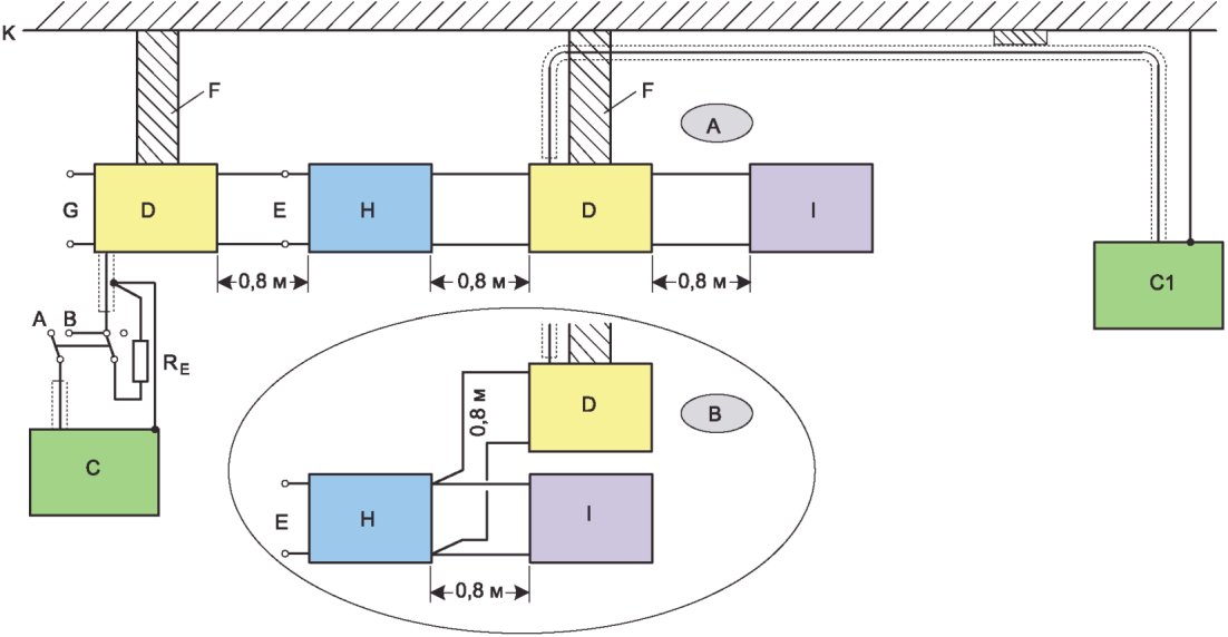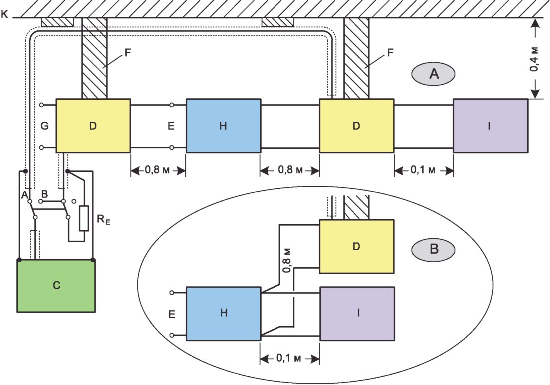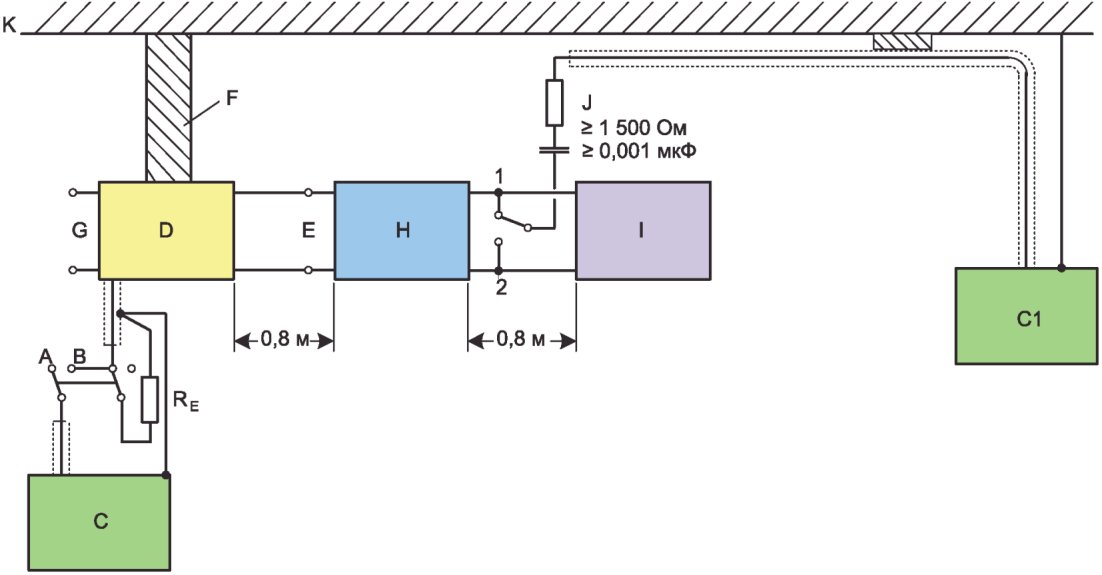 D.4.3 Емкостные клещи связи согласно подразделу 6.4 IEC 61000-4-4:2012 должны располагаться на расстоянии не более 1 м от СБП на любом входящем или выходящем кабеле.