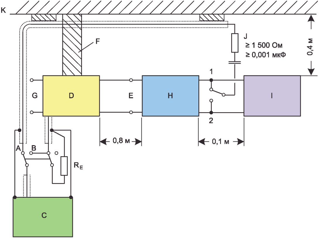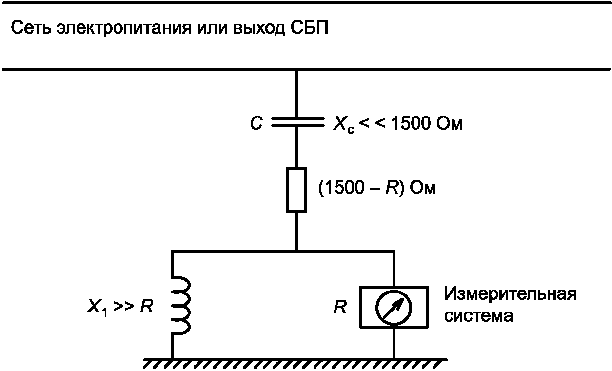 Напряжение на клеммах сетевого электропитания можно измерить с помощью пробника напряжения в соответствии с разделом 5 CISPR 16-1-2:2014, как показано на