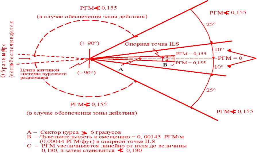 б) под углами +/- 10° и +/- 35° к осевой линии ВПП | Для одночастотного КРМ каждый комплект проверяется под углами 0° и +/- 10° |