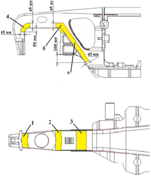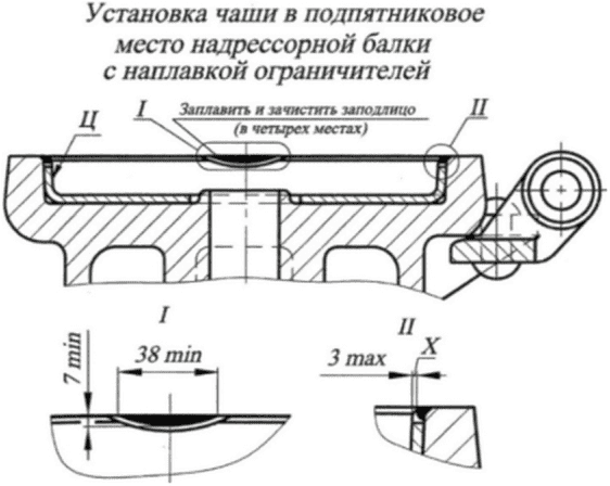 Угол между ограничительным буртом и наклонной плоскостью поз. 7 и 6 | Трещина | Визуальный осмотр, МПК | - | Не переходящая на верхний пояс | Ремонт сваркой | Визуальный осмотр, МПК |
