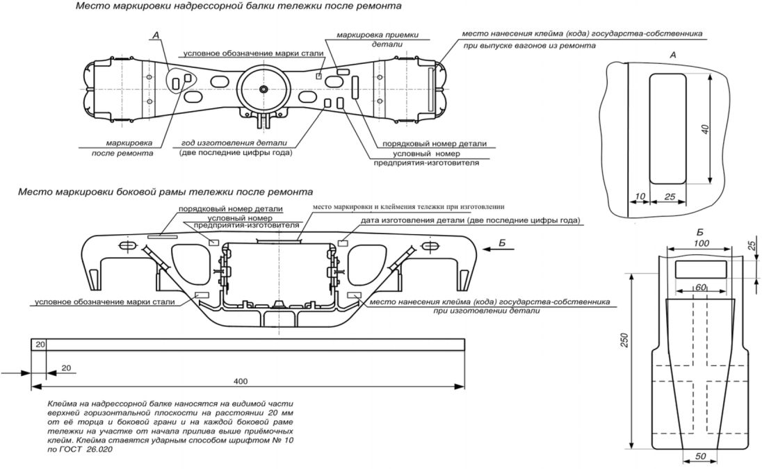 Все износостойкие элементы, устанавливаемые на тележки, должны иметь маркировку: условный номер предприятия-изготовителя и дату изготовления, нанесенную ударным способом на каждой детали в местах, указанных в конструкторской документации. Знаки маркировки на клине фрикционном могут быть отлиты или нанесены ударным способом. Маркировку износостойких элементов производит предприятие-изготовитель.