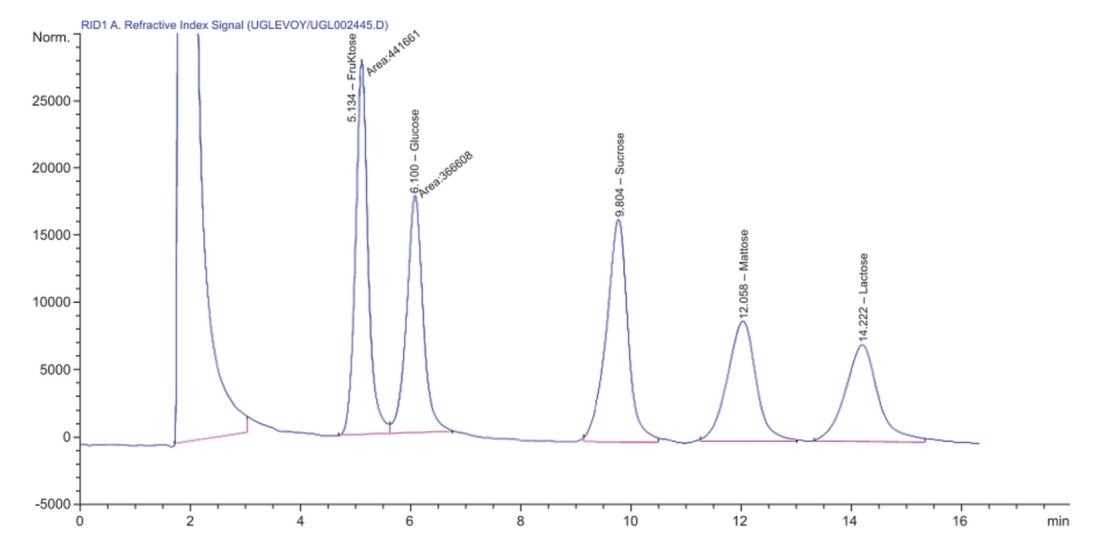 Предел количественного определения (LOQ) для глюкозы, фруктозы, сахарозы, лактозы, мальтозы составляет 2,5 г/кг.