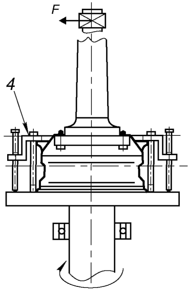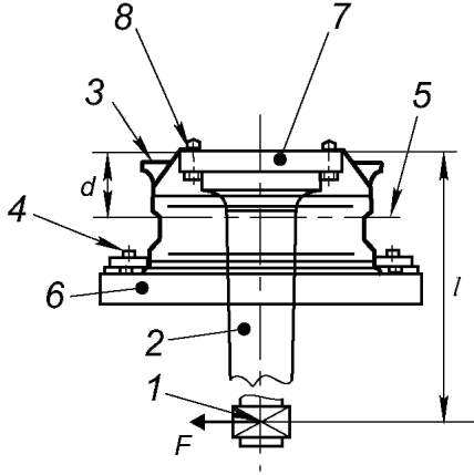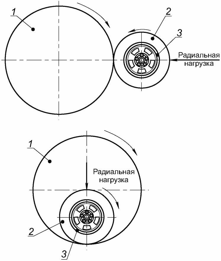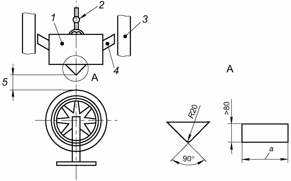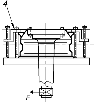 Е.1.7 При установке колеса на опору используют такой же метод крепления, как и при установке колеса на транспортное средство. Опора должна быть расположена относительно ударника таким образом, чтобы при ударе вектор скорости приходился в центр колеса. Удар должен прийтись в наиболее слабую часть диска колеса.