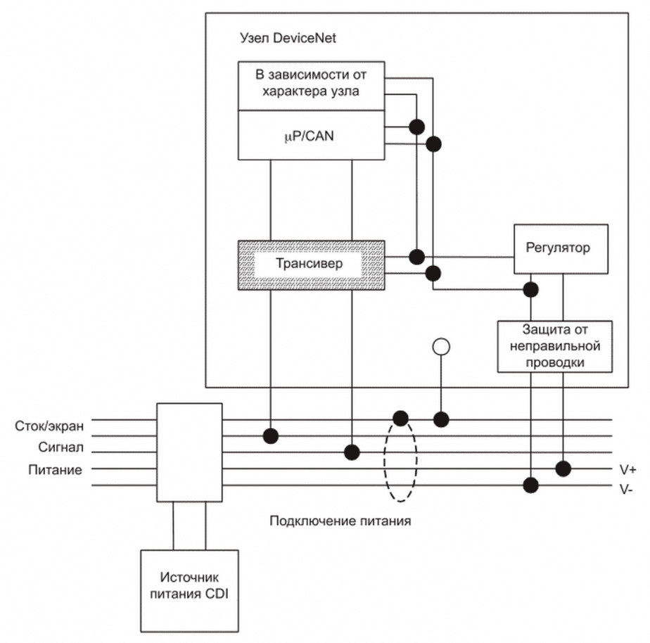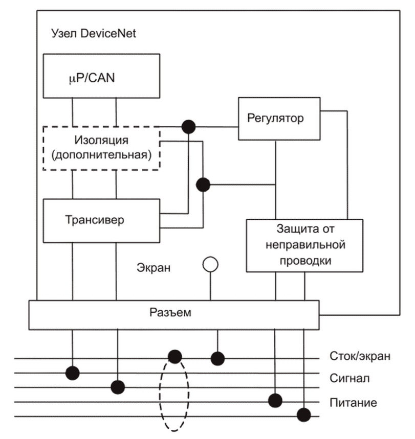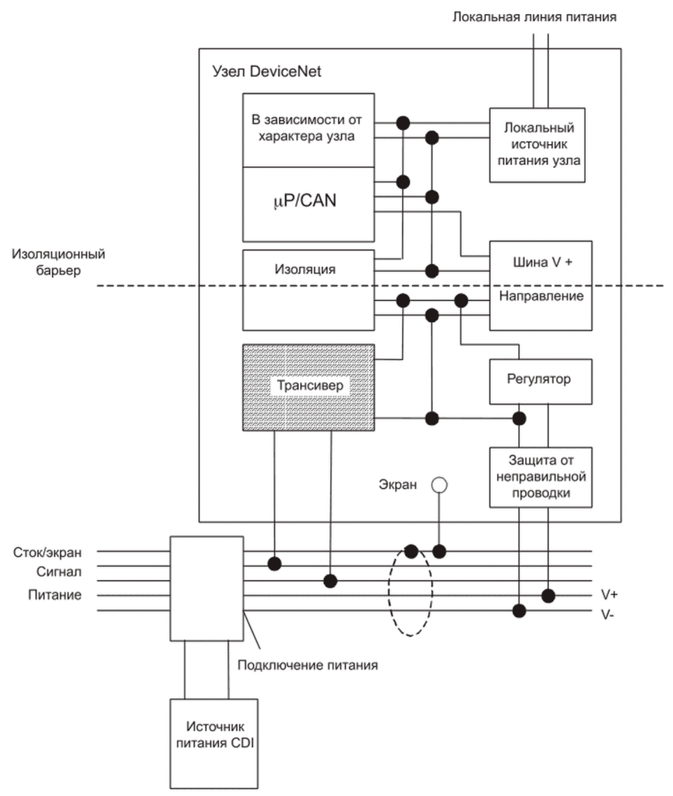 - получает и оценивает сообщения DeviceNet;
