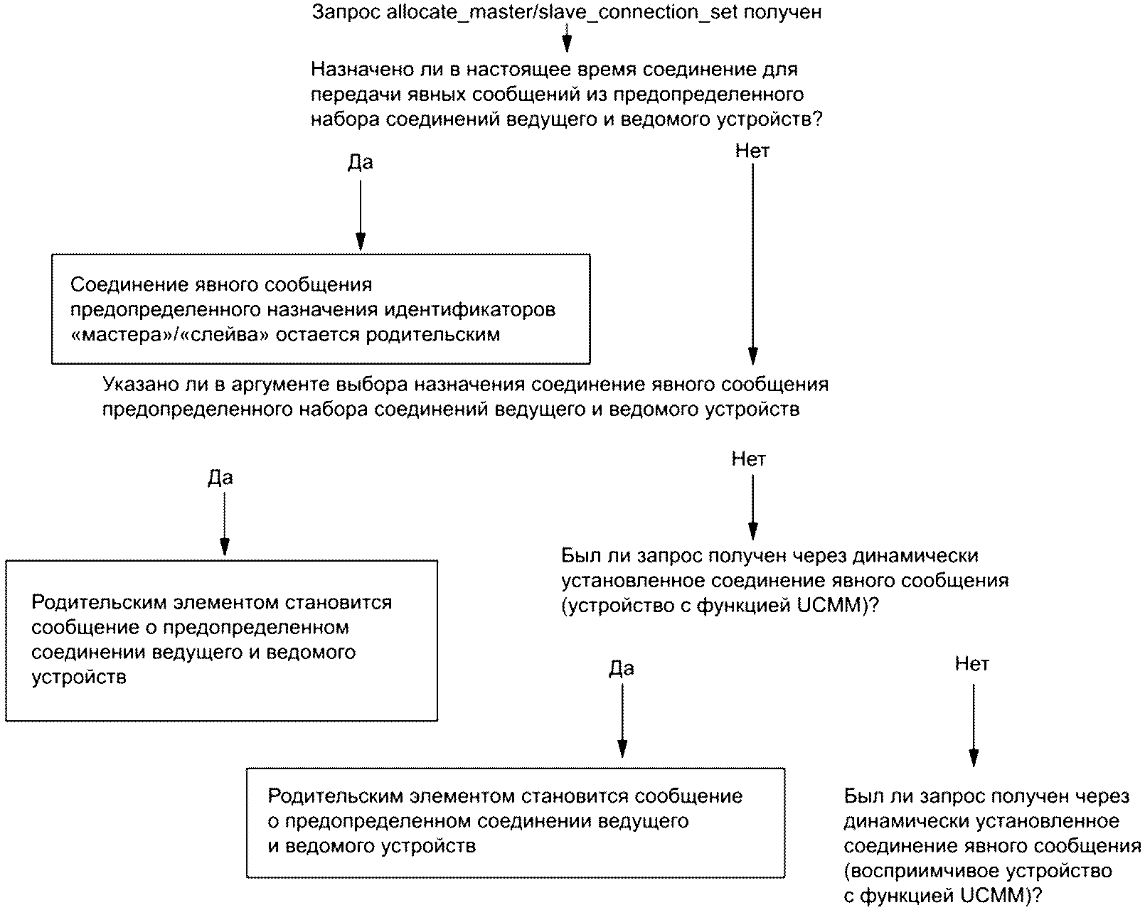 - первое явное сообщение передается и принимается так, как определено в предопределенном наборе соединений ведущего и ведомого устройств;