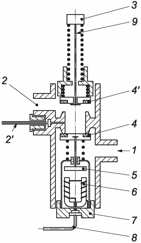 2' - выход к запальной горелке; 3 - кнопка; 4 - клапан