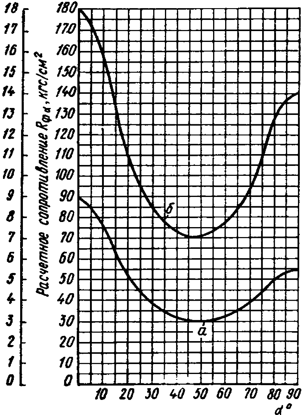 СНиП II-В.4-71 "Расчетные сопротивления древесины растяжению под углом", принимаются по