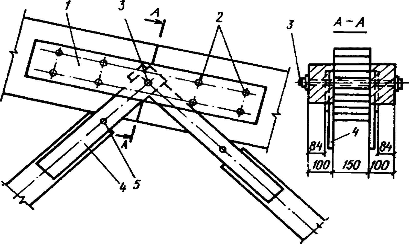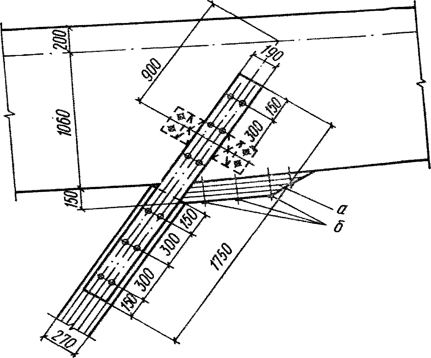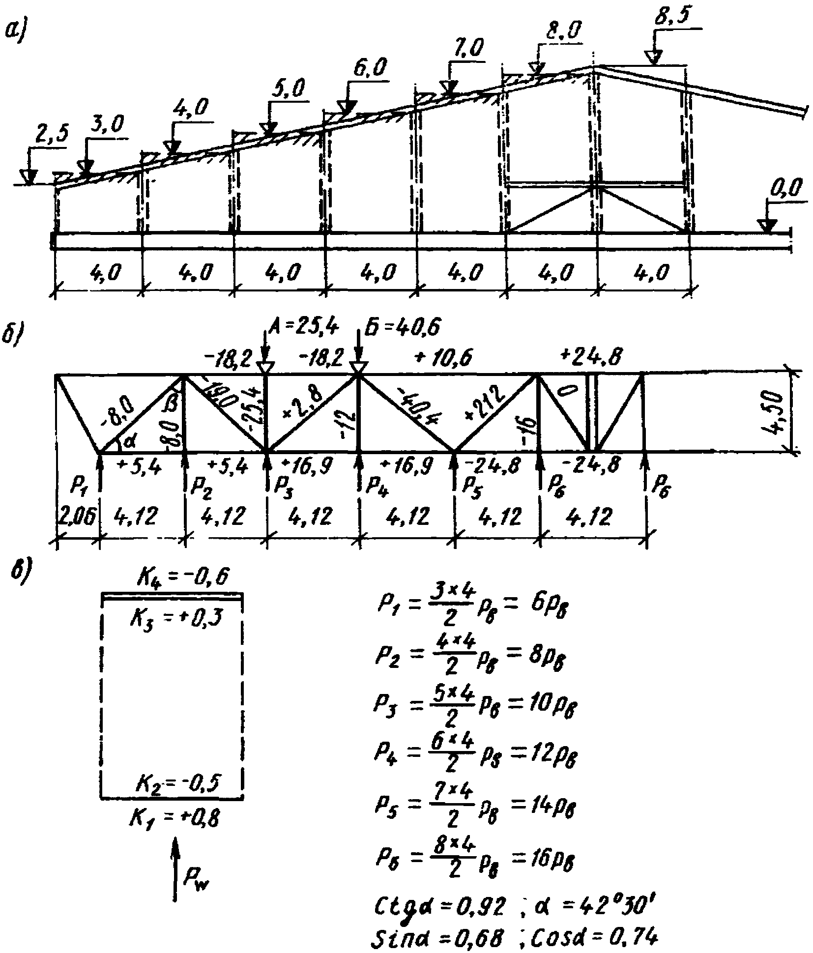 рис. 89, передача опорных давлений от ветровой фермы на продольные (наклонные) связи осуществляется с помощью боковых накладок, связывающих между собой ригель и подкосы; в результате получаются консольные балки с опорами в уровне фундаментов и прогона продольных связей. Сечение накладок, в запас прочности, назначаем из условия восприятия каждой из них половины опорного момента консольной балки
