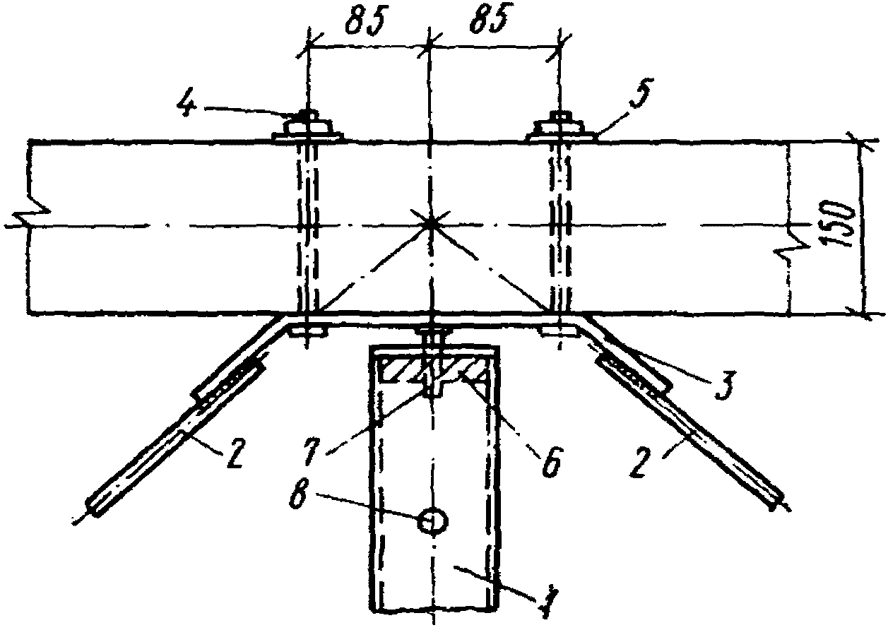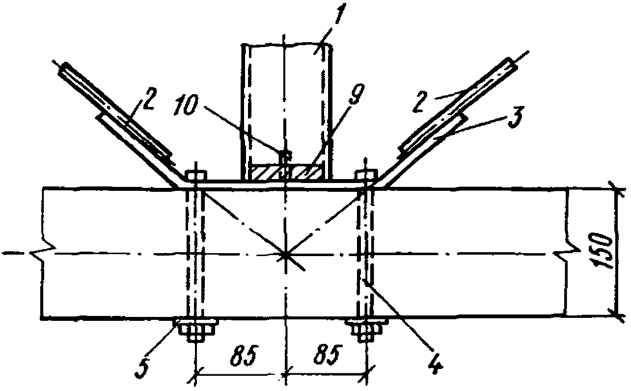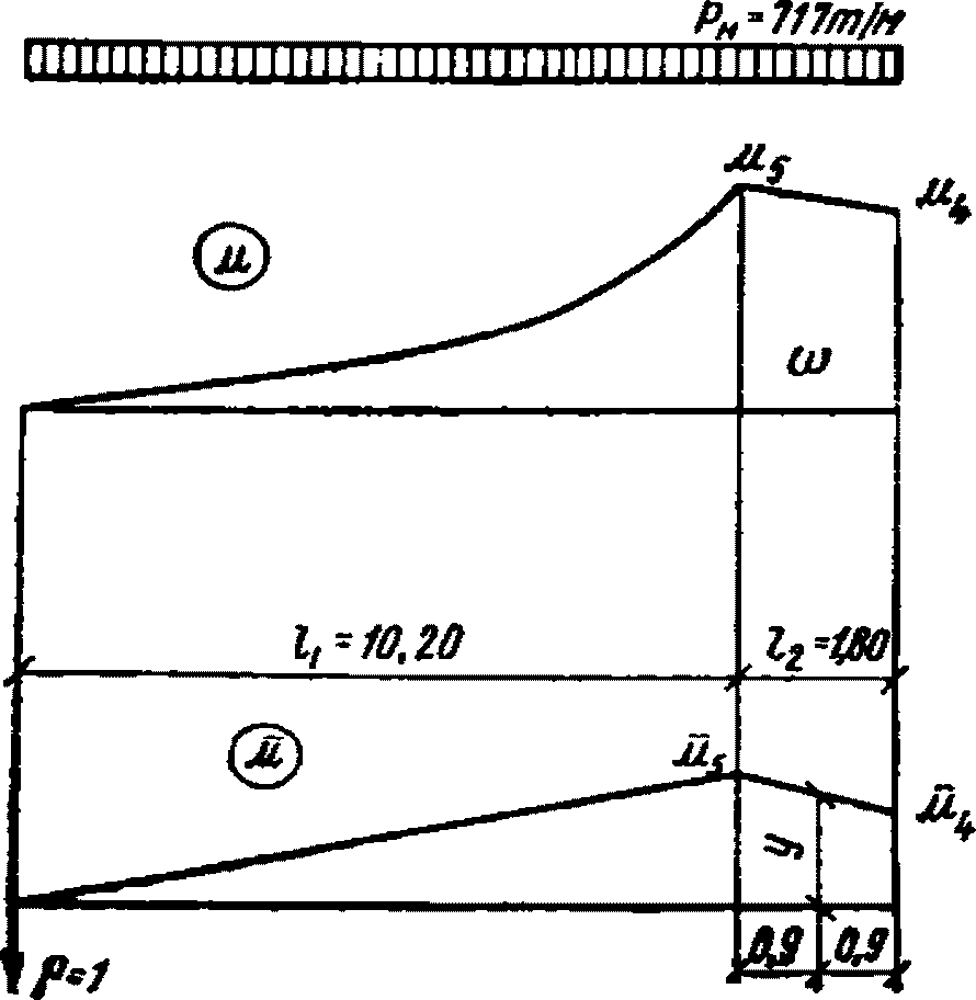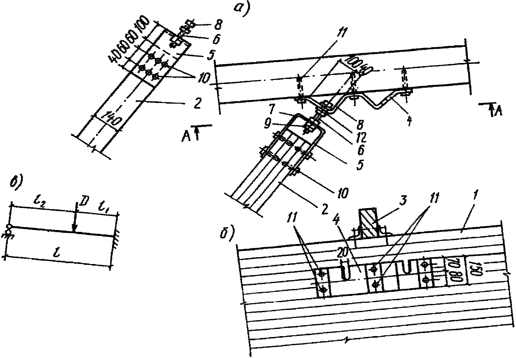 рис. 89, передача опорных давлений от ветровой фермы на продольные (наклонные) связи осуществляется с помощью боковых накладок, связывающих между собой ригель и подкосы; в результате получаются консольные балки с опорами в уровне фундаментов и прогона продольных связей. Сечение накладок, в запас прочности, назначаем из условия восприятия каждой из них половины опорного момента консольной балки