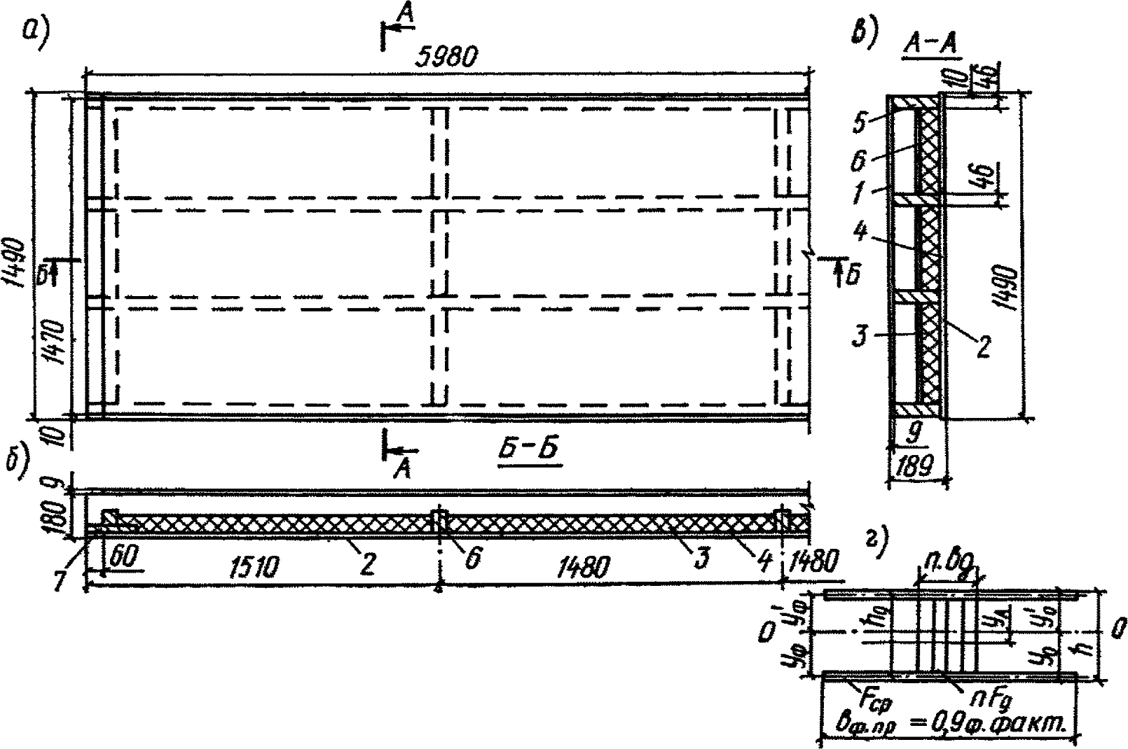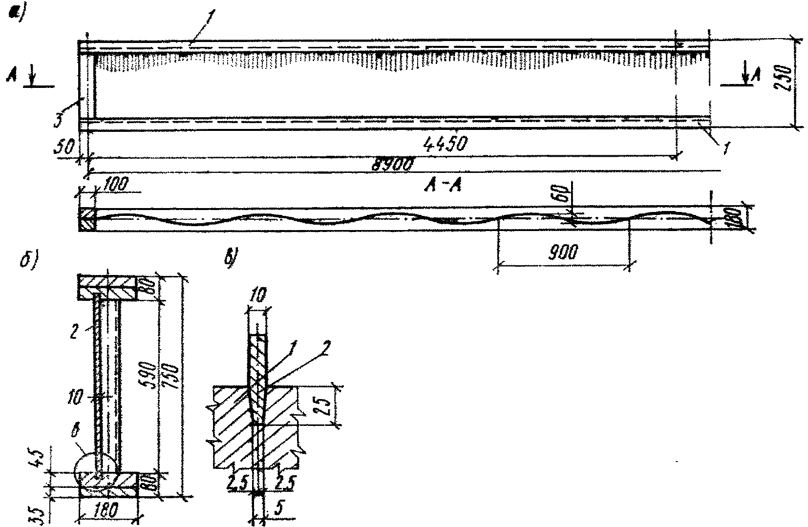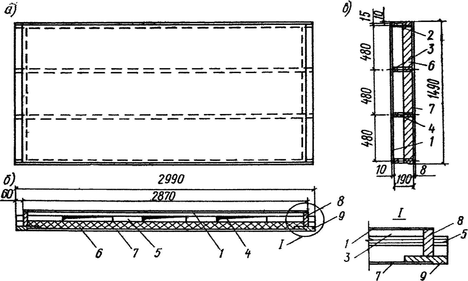 | Панели покрытий | Панель 1 - с поперечным проветриванием, панель 2 - с продольным проветриванием - для рулонной кровли; панель 3 - для кровли из волнистых асбестоцементных листов, укладываемых на месте. Неутепленные панели предназначены для устройства рулонной кровли. Обшивка всех панелей - из водостойкой фанеры или асбестоцементные |