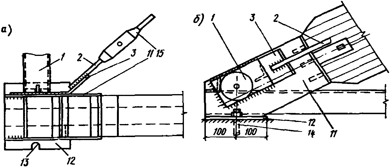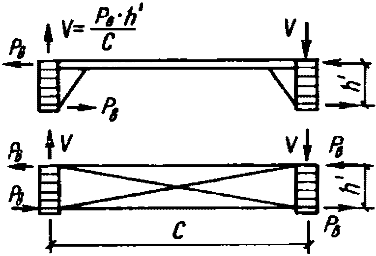 вторую - при подъеме конструкции в вертикальном положении, когда она, как правило, работает по двухконсольной балочной схеме с изменением знака в поясах по сравнению с основным расчетным случаем нагружения; на этом этапе, если оба пояса фермы жесткие, нижний пояс вместо растяжения испытывает сжатие и должен быть проверен на устойчивость из плоскости конструкции, верхний же пояс при подъеме вместо сжатия работает на растяжение, и необходима проверка в нем стыковых соединений. Если же нижний пояс гибкий, как это имеет место в металлодеревянных фермах, то при подъеме с помощью траверсы он выключается, как правило, из работы, а верхний пояс при этом работает на изгиб, и наиболее опасным оказываются стыковые соединения в нем;