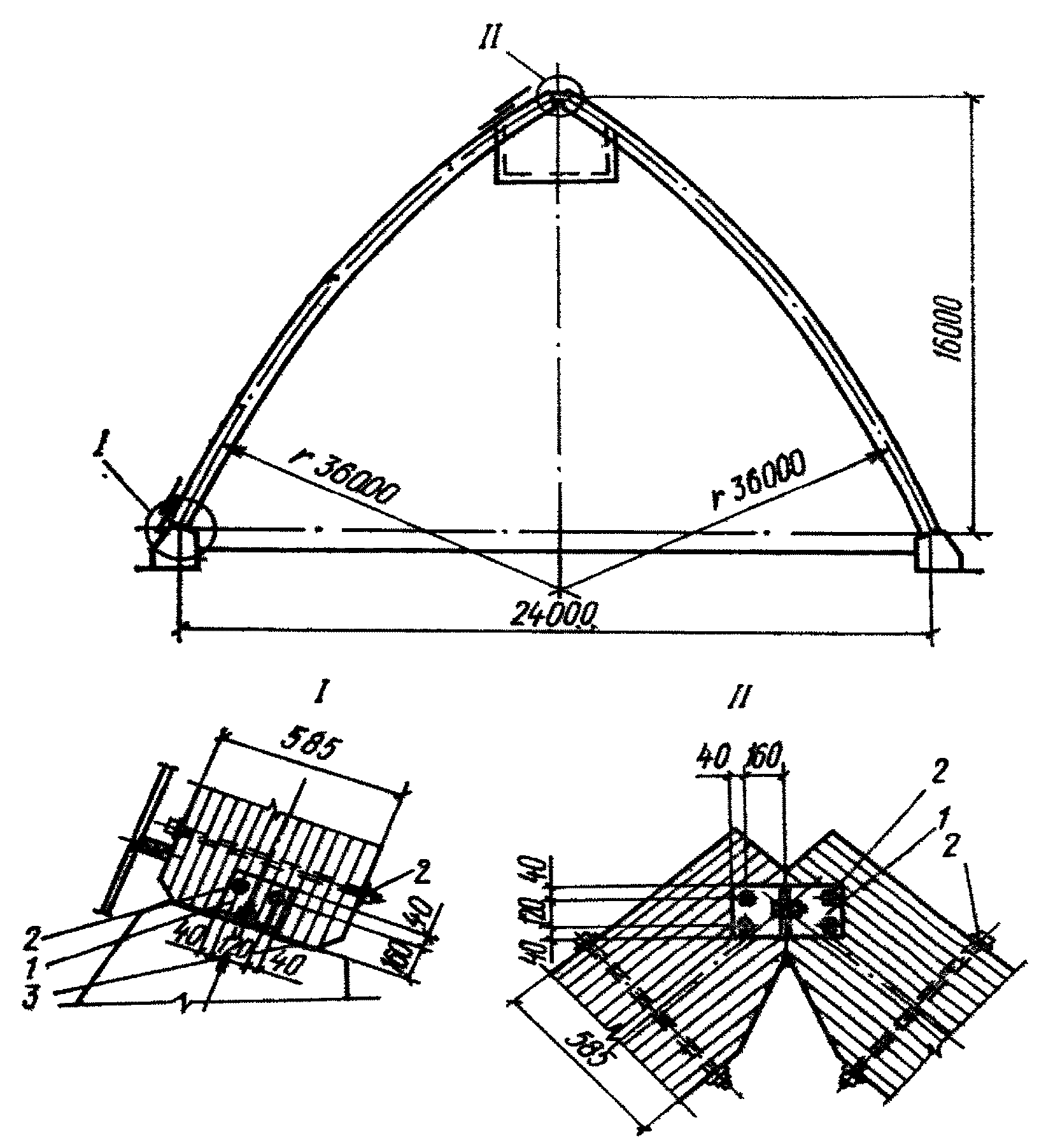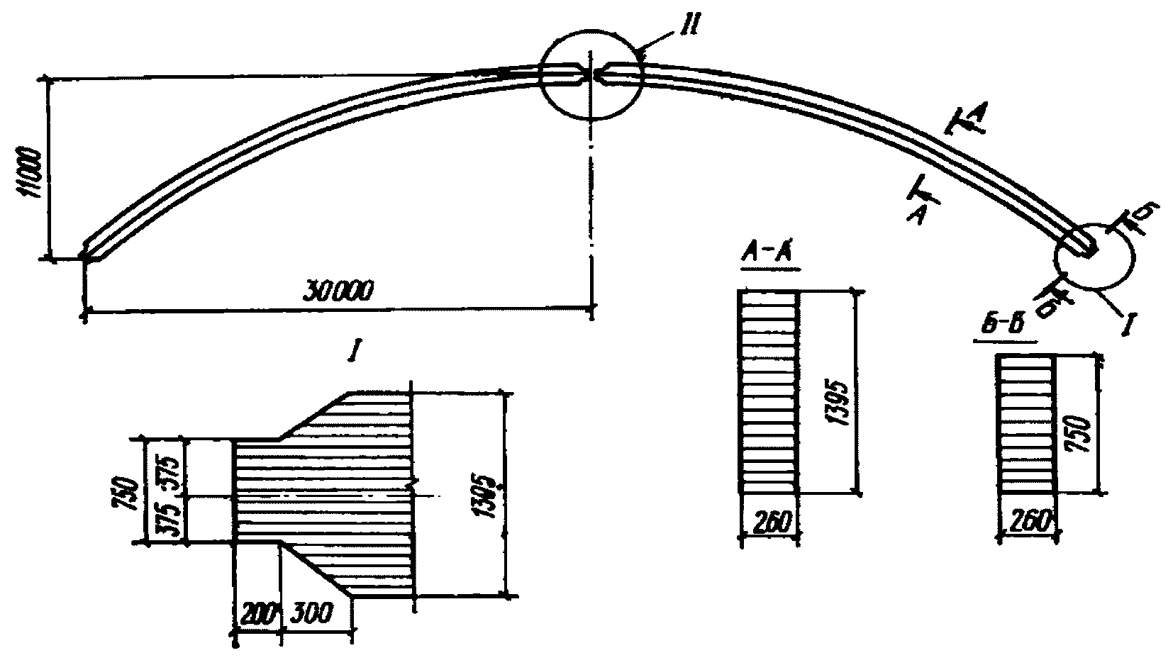 | Арки | Все арки - прямоугольного сечения из массивной клееной древесины. Арки типа 1 (пологие) - кругового очертания, двухшарнирные и трехшарнирные с передачей распора на затяжку или опоры. Арки типа 2 (высокие) - стрельчатые трехшарнирные, с передачей распора, как правило, на опоры |