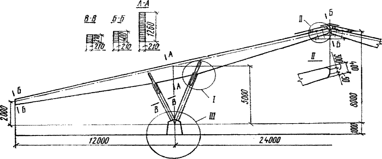 | Трехшарнирные рамы | Стойки и ригели всех рам прямоугольного сечения из массивной клееной древесины (дощатоклееные). Полурамы типов 1, 3 и 4 - заводского изготовления. |