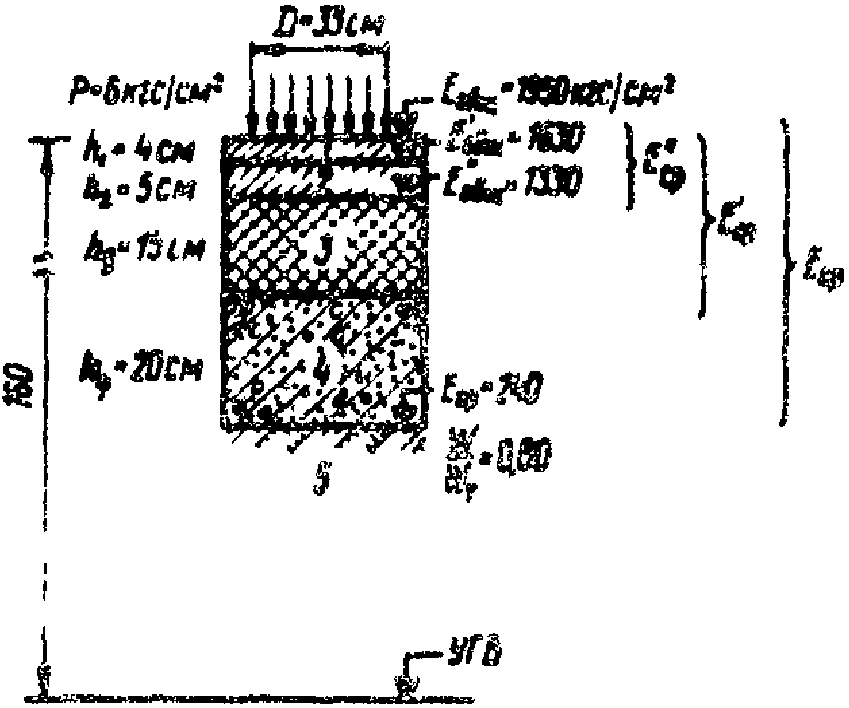 а) модуль упругости верхнего слоя асфальтобетона при 10 °C - 15000 кгс/см2, а нижнего при 10 °C - 10000 кгс/см2; сопротивление растяжению при изгибе асфальтобетона (нижнего слоя) при N = 300 авт/сутки Ru = 12·1,15 = 12,8 кгс/см2 (см. приложение 3 ВСН 46-72);