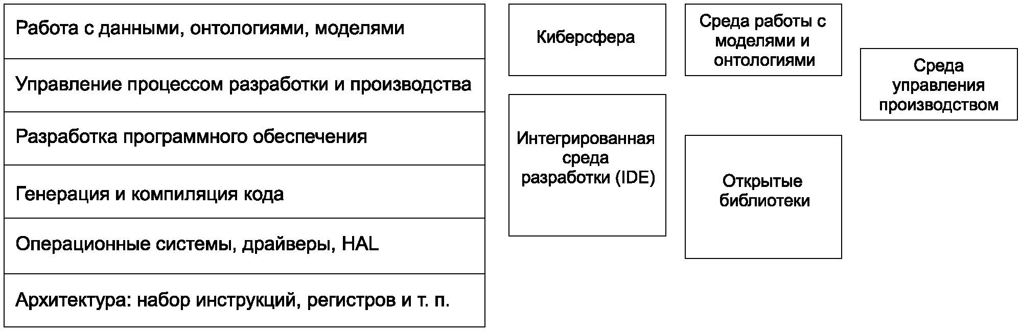 В основе программного управления киберфизической системой лежит архитектура вычислительной системы (в т.ч. набор инструкций, регистров и других ее характеристик). В опоре на архитектуру строятся системные компоненты программного обеспечения, в т.ч. слои абстракции аппаратной реализации (HAL), операционные системы и драйверы. Следующим уровнем является генерация кода и компиляция кода, предназначенная для перевода языков высокого уровня, в т.ч. графических, в машинный код или специальные инструкции, характерные для данной архитектуры и системных компонентов. Уровень разработки программного обеспечения включает в себя написание кода, работу с графическим представлением программы, отладку программ. Разработка программного обеспечения на следующем уровне программной реализации киберфизических систем включается в более комплексные процессы управления разработкой и производством (так называемые процессы DevOps), в т.ч. обеспечения совместной полипозиционной разработки, процесса производства киберфизических систем и др. Целостное представление киберфизических систем возможно благодаря работе с уровнем представления онтологий и моделей, лежащих в основе системы, а также анализу данных киберфизических систем.