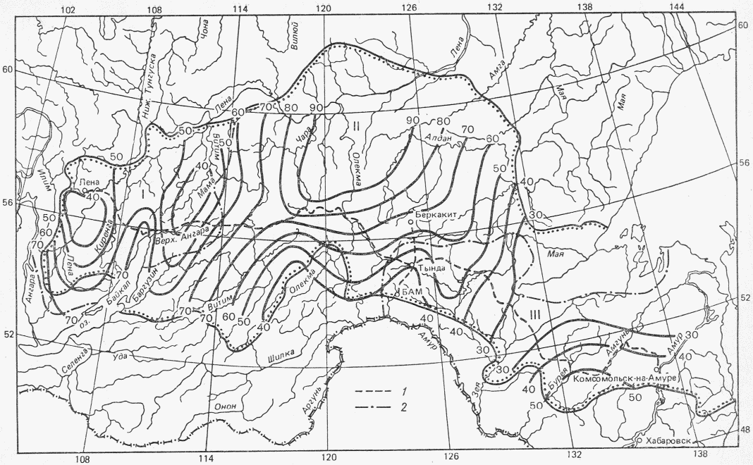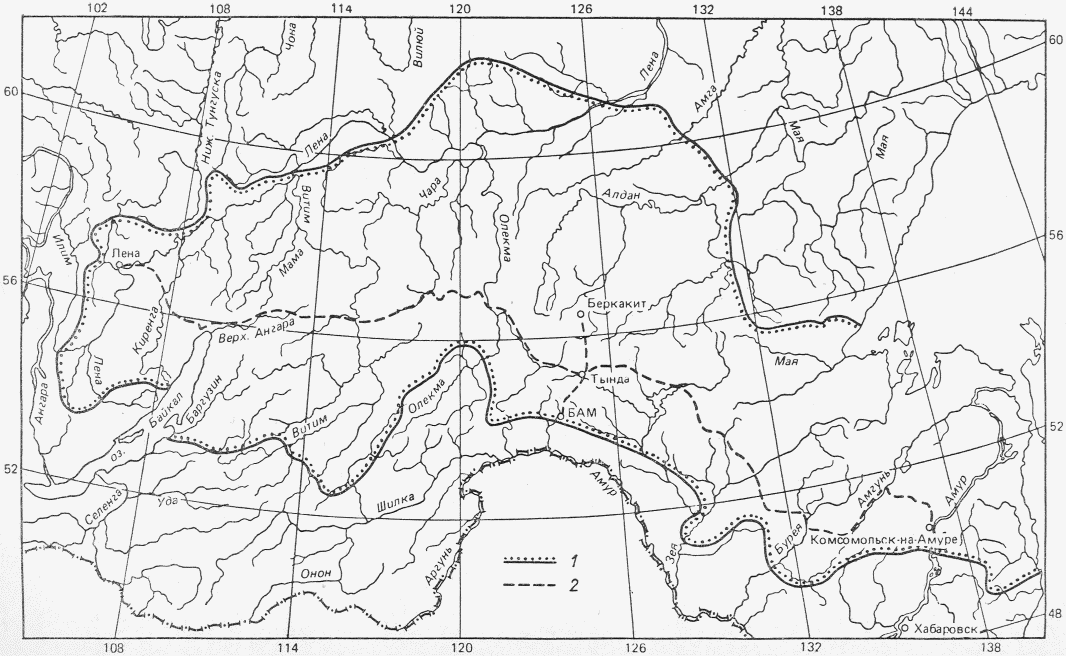 1 - граница зоны БАМа, 2 - трасса БАМа
